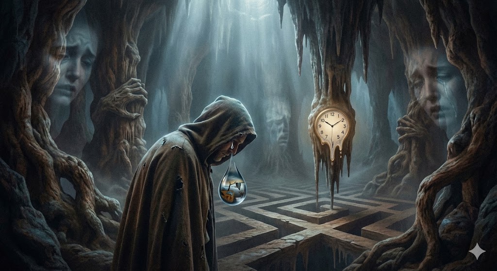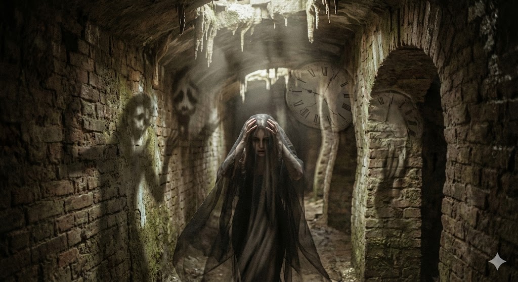 A figure, shrouded in semi-transparent guilt, lost and disoriented, wanders a vast, subterranean labyrinth of crumbling brick and dripping stalactites. Ethereal light filters from unseen cracks above, casting long, distorted shadows that morph into accusing faces. Double exposure of fractured clock faces overlay the architecture, hinting at the weight of time and regret. The scene evokes a sense of claustrophobia and shame, reminiscent of Dali's surreal landscapes, with melting perspectives and impossible geometries. Cinematic lighting emphasizes the texture of the stone and the figure's ethereal form, creating a dreamlike atmosphere of profound sorrow and disorientation within the earth.