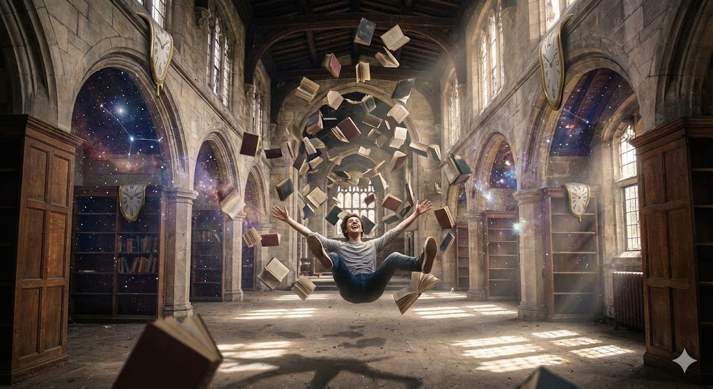 A figure in ecstatic freefall, limbs splayed in euphoric surrender, plunges through the echoing halls of a deserted university campus. Books ascend instead of falling, forming a swirling vortex around the descending figure. Double exposure reveals shimmering constellations within the collapsing architecture. Ethereal light filters through fractured windows, casting long, distorted shadows. Salvador Dali-esque melting clocks drip from ornate cornices. A palpable sense of boundless, euphoric freedom fills the descent.