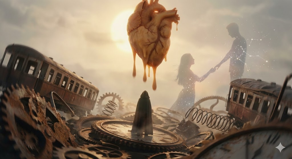 A figure lost within a swirling vortex of clockwork gears and fragmented train carriages, disoriented and adrift. Above, a colossal, melting heart eclipses the sun, casting long, surreal shadows across the mechanized landscape. Double exposure: faint, ghostly lovers reach for each other through the machinery, their forms dissolving into constellations of shimmering stardust. Ethereal light bathes the scene in a dreamlike glow, creating an atmosphere of both profound longing and unsettling disorientation. Salvador Dali influence, cinematic lighting, soft focus.