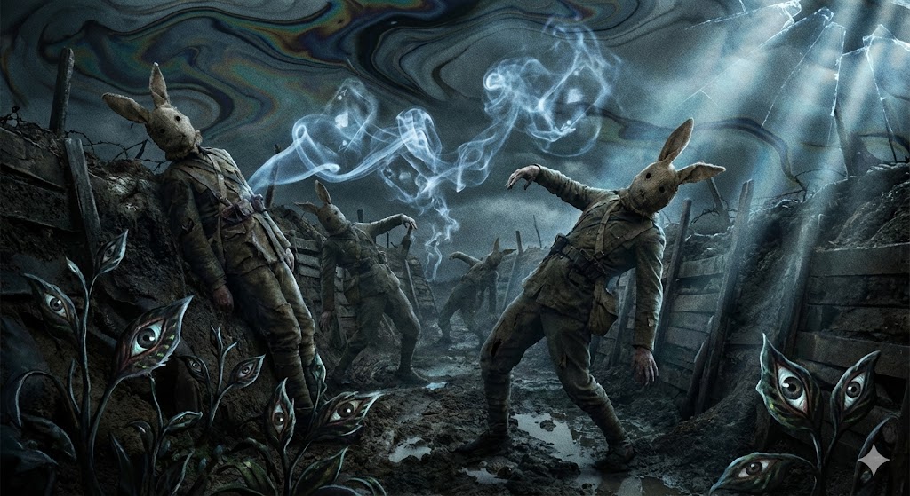 Sensory distortions ripple across a desolate battlefield, trenches choked with nightmarish flora that bloom with eyes; soldiers frozen mid-stride, limbs elongated and grotesque like melting clocks, their faces obscured by superimposed rabbit masks; ethereal smoke swirls, forming phantom playing cards in the air, all bathed in an oil-slick darkness pierced by shards of cinematic, otherworldly light, evoking a paralyzing dread.