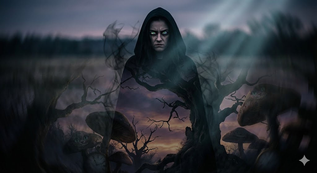 A figure, wreathed in oil-slick shadows, floats ethereally above a twilight field that bleeds into a gnarled, ancient forest, both landscapes overlapping in spectral double exposure; cinematic lighting highlights a defiant, almost cruel self-assuredness in their gaze; Alice in Wonderland's distorted proportions and unsettling details subtly integrated into the trees and sky; soft edges and a dark, oppressive atmosphere amplify the dreamlike horror, suggesting both flight and a terrifying, unstoppable power.