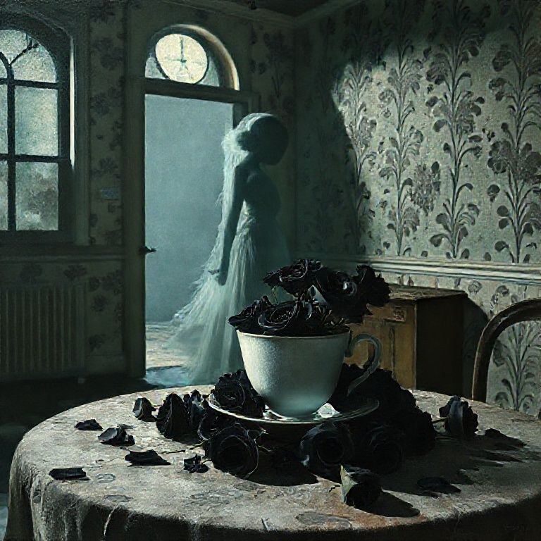 A lost sense of direction within a claustrophobic elevator, bathed in ethereal, cinematic lighting. Soft-edged oil painting style with double exposure of blooming, thorny roses overlaying cracked elevator walls. Alice in Wonderland motif: a distorted, oversized teacup sits on the floor, overflowing with shadows. Dark atmosphere, a palpable sense of dread intermingling with an unexpected aura of strength and self-assuredness. Horror vibes.010: Ethereal oil painting of a decaying home, bathed in cinematic, moonlit shadows. Double exposure of a spectral figure fading through the walls, their form dissolving into the wallpaper's unsettling floral patterns. A single, oversized teacup sits on a dusty table, overflowing with black roses. Soft-edged and dreamlike, the scene evokes a chilling peace amidst the abandonment, imbued with a dark, Alice in Wonderland horror.