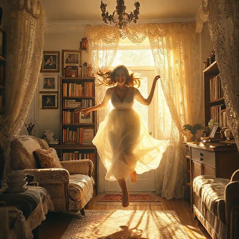 A luminous figure, dissolving at the edges, fleeing through a double-exposed home; domestic objects – teacups, family portraits, overflowing bookshelves – swirl in a joyful, ethereal dance around the chase. Golden light filters through lace curtains, creating a sense of cinematic, dreamlike pursuit bathed in happiness and wonder.
