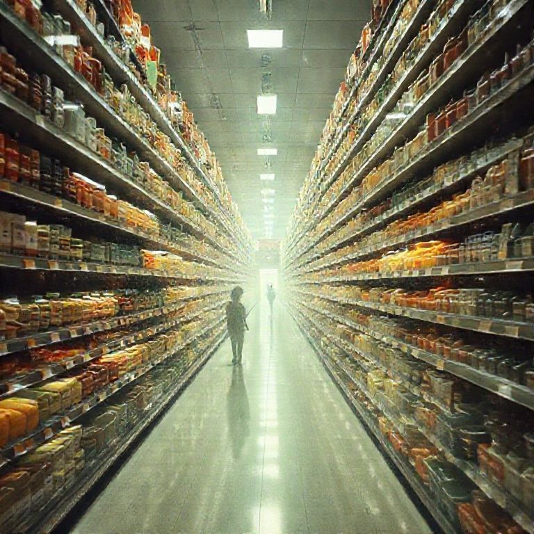 A labyrinthine supermarket aisle stretches into infinite, echoing space, shelves dissolving into shimmering mist filled with spectral produce and obsolete technology. Faint, ethereal figures drift through, reaching for phantoms of groceries. Soft, cinematic light illuminates dust motes dancing in the air, casting long, distorted shadows. Double exposure: superimposed memories of childhood kitchens flicker across the scene like fractured holograms. A pervasive sense of nostalgia and loss hangs heavy, creating a dreamlike tableau of forgotten purchases and half-remembered tastes.