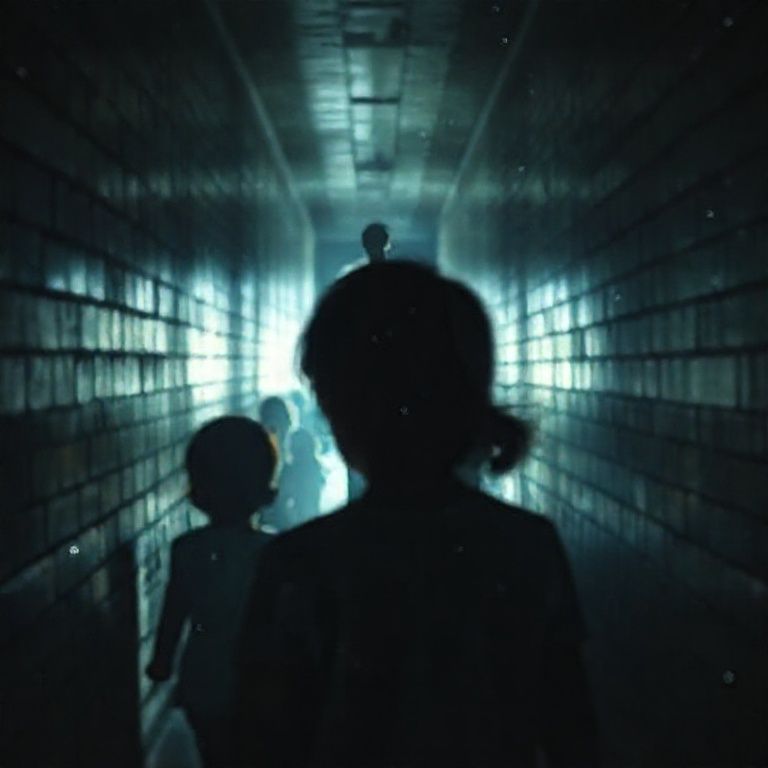 Children, their faces softly blurred, navigate an endless labyrinth of echoing corridors. A translucent figure of a parent watches from a distance, layered into the walls with a subtle double exposure. Ethereal shafts of light pierce the darkness, illuminating dust motes dancing in the air, hinting at both hope and a tangible sense of expectant waiting. Cinematic lighting emphasizes the mystery, creating soft edges and a dreamlike atmosphere.