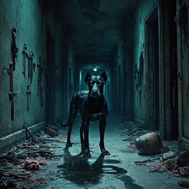 A labyrinth of decaying corridors bathed in ethereal, cinematic moonlight, soft focus edges blurring reality. Symbolic weapons, tarnished keys, and dripping, soiled objects litter the passage, layered with double exposure glimpses of churning viscera. A sleek black dog stands sentinel amidst the grime, radiating quiet disgust and resistance.