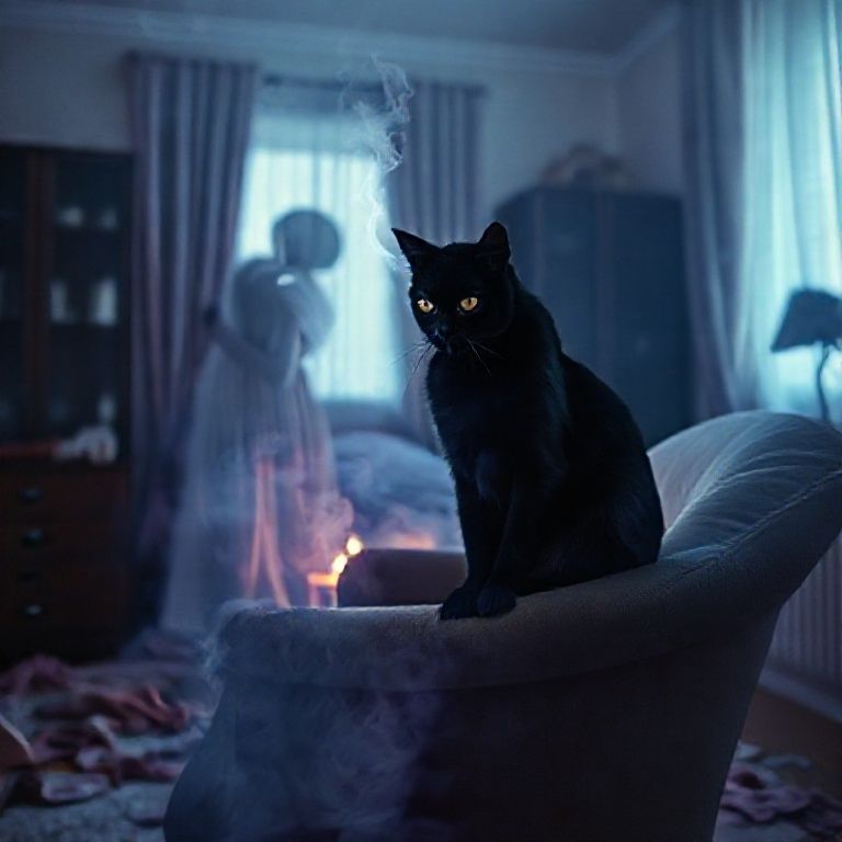 Ethereal double exposure: a melancholic bedroom scene in an unfamiliar apartment, subtly overlaid with ghostly figures embracing and turning away from each other; soft cinematic lighting bathing the room in pale blue and violet hues; a sleek black cat exhales smoke from a lit joint, perched on a velvet armchair amidst scattered silk scarves, its eyes reflecting the sadness and sense of loss pervading the space.