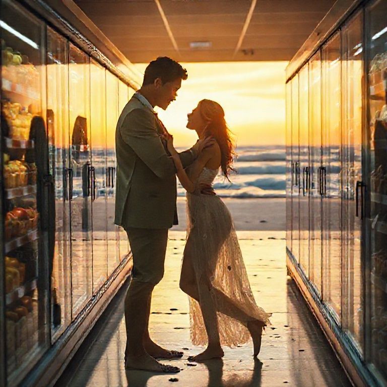 A supermarket aisle dissolves into a sun-drenched beach at sunset. Figures, radiating confidence and power, engage in intimate, ghostly embraces amidst produce displays and crashing waves. Ethereal light spills from the refrigerated cases, illuminating double exposed scenes of longing and infidelity playing out in the sand. Soft focus, cinematic lighting, surreal and dreamlike.