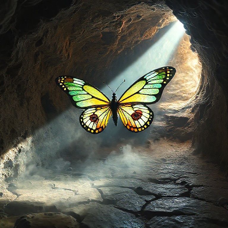 A luminous butterfly with stained-glass wings emerges from a cracked geode within a damp, subterranean cellar illuminated by a single, melancholic shaft of light. Double exposure layers reveal human eyes reflecting the cavern walls, suggesting a metamorphosis both beautiful and terrifying. Ethereal mist clings to the uneven stone floor, while cinematic lighting highlights the creature's unexpected birth in this forgotten space. Soft edges blur the distinction between reality and dream.