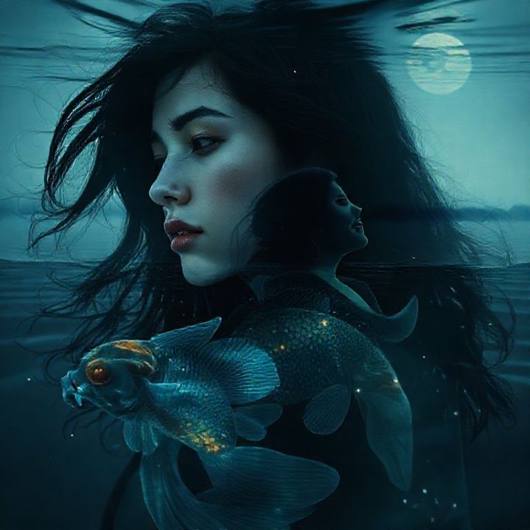 Ethereal cinematic double exposure: A woman, partially submerged in shimmering moonlit water, intertwined with the ghostly silhouette of a koi carp. Her face, half-obscured by flowing dark hair, holds an expression of melancholic longing, overlaid with faint, iridescent scales. Around her, the water ripples with a phantom reflection of another woman, laughing in the distance, her form dissolving into the misty horizon. Soft, diffused light illuminates the scene, casting long, distorted shadows that suggest both intimacy and betrayal beneath the surface of a still, inky river.